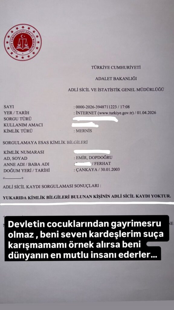 Emir Dopdoğru, adli sicil kaydını kamuoyuyla paylaşarak hakkında ortaya atılan iddialara yanıt verdi. Sabıka kaydının temiz olduğunu gösteren bu paylaşım, özellikle gençlere yönelik bir mesaj olarak yorumlandı.
